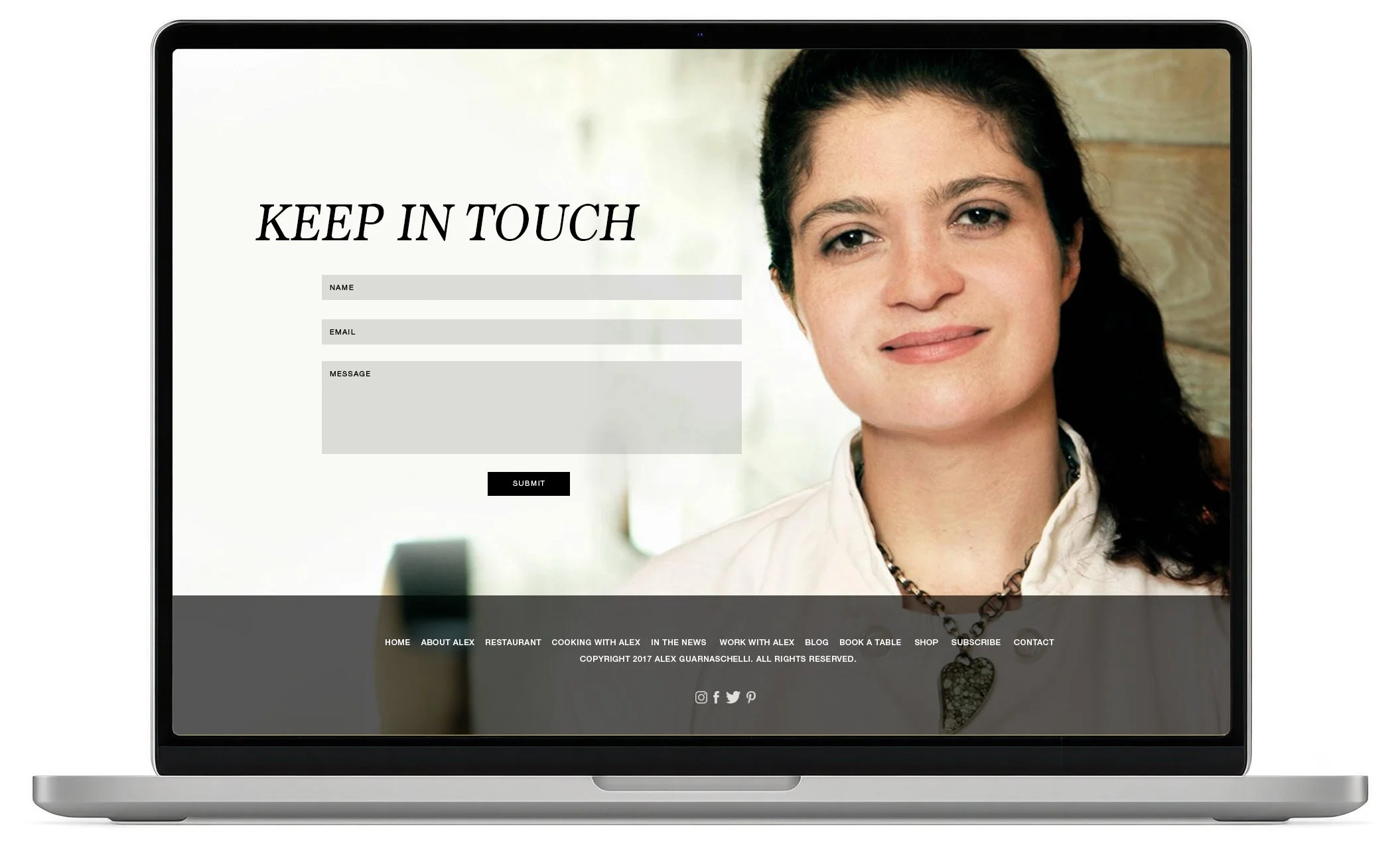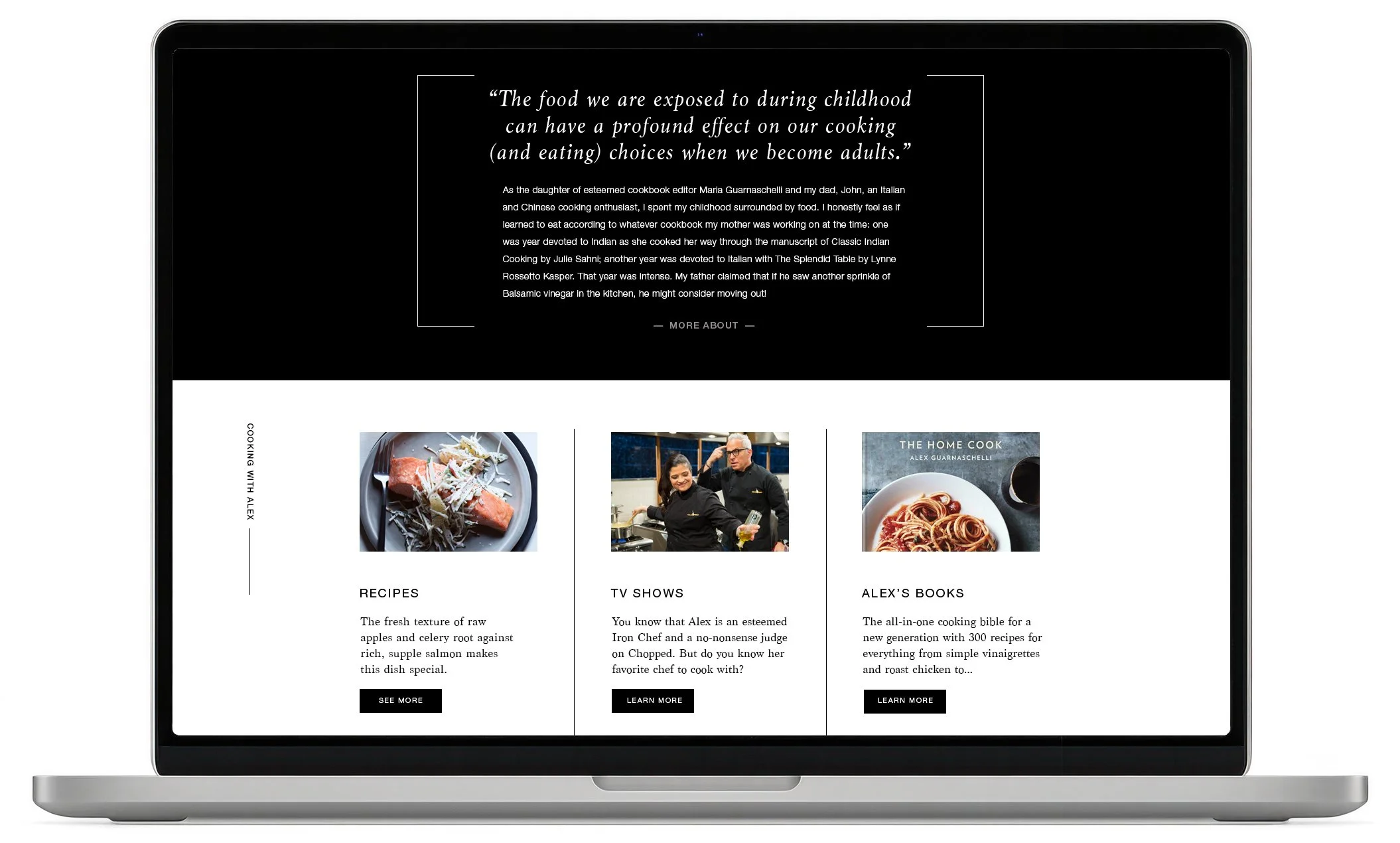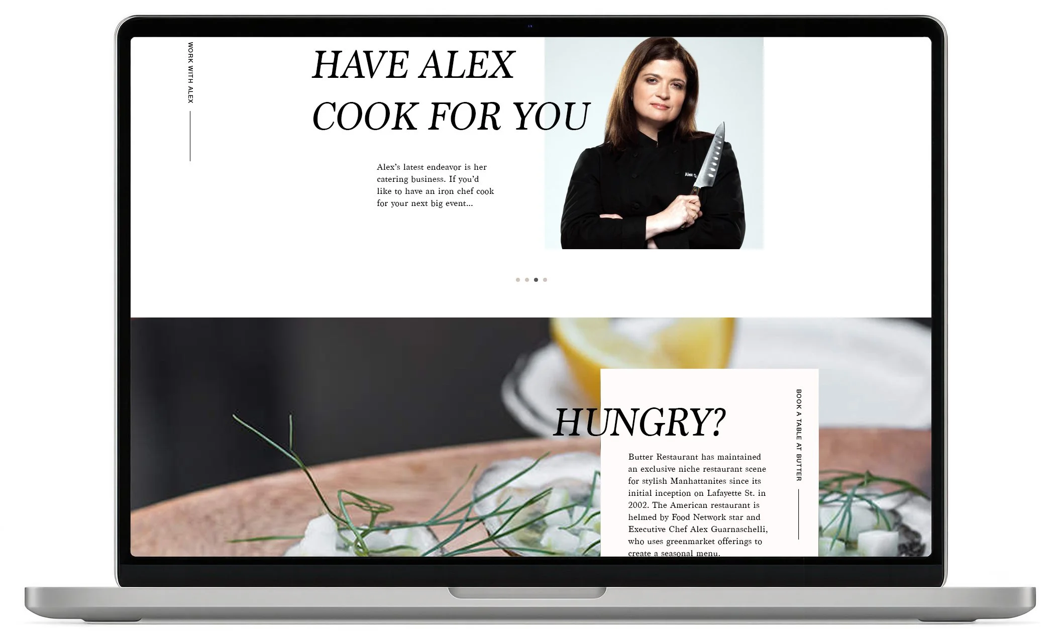 A multi-faceted initiative to elevate celebrity chef Alex Guarnaschelli's brand identity and online presence. This ongoing relationship involved the design and execution of her logo and identity, a complete redesign and development of her website and e-commerce platform, strategic ideation for promotional digital campaigns, and the design and production of branded merchandise.